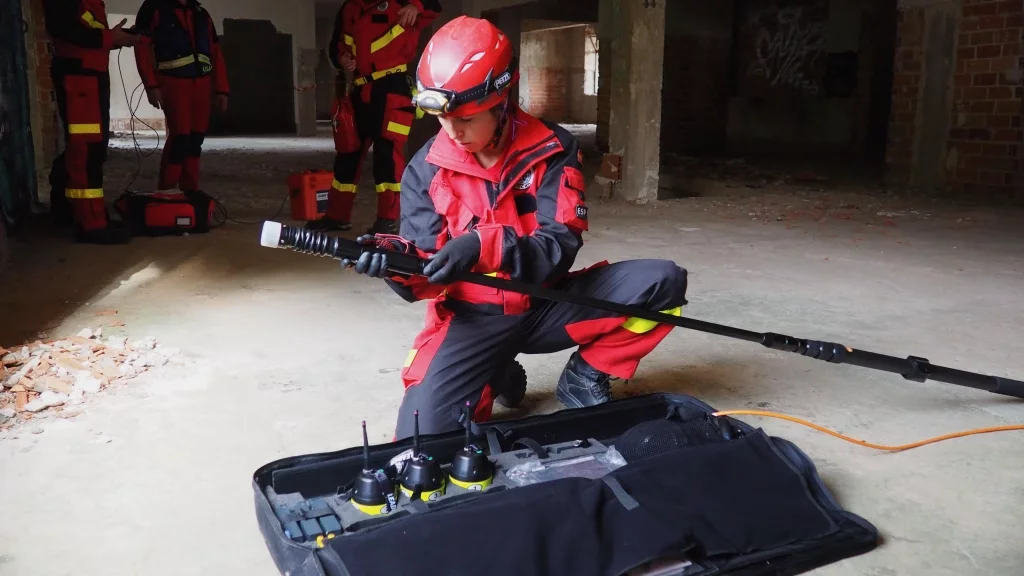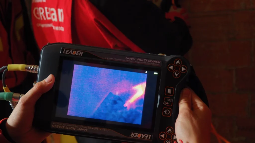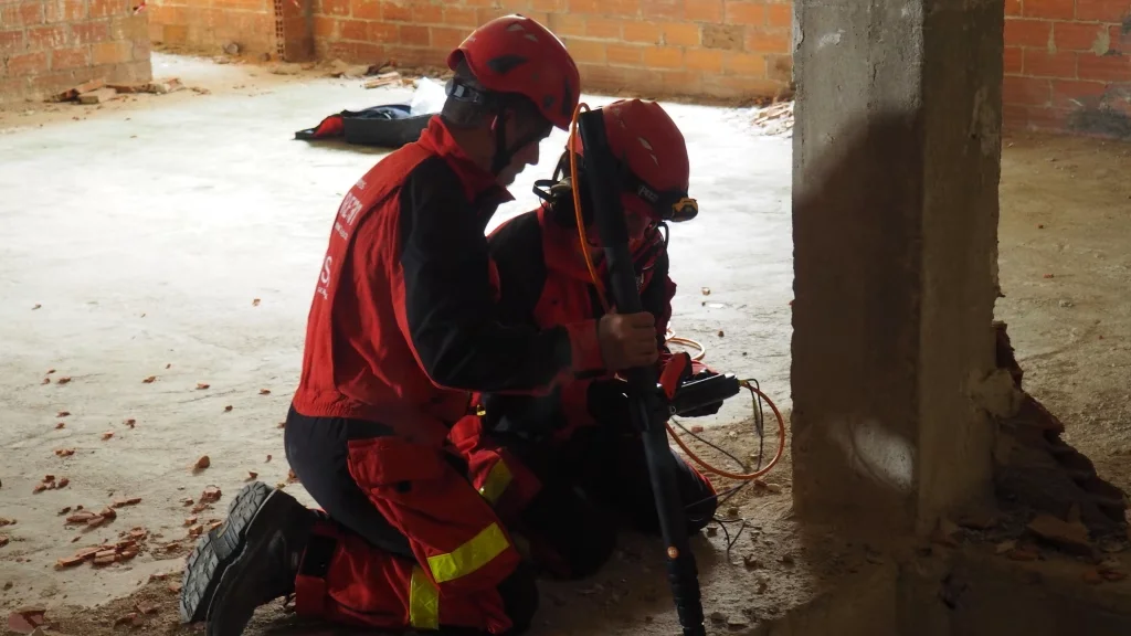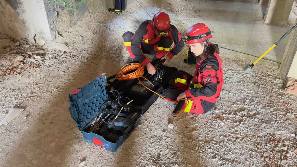 Posteriormente, tras asegurar la estructura de la ventana, ingresó al edificio el equipo de localización técnica para las tareas de búsqueda de víctimas. En particular, este grupo utiliza equipos de última generación como el radar scan (LEADER SCAN MS 1), la cámara térmica (Tecnología al servicio USAR) y el geófono (Prácticas RADAR SCAN y Geófono). De modo que, el radar scan es capaz de detectar movimientos mínimos en espacios confinados y bajo escombros, mientras que la cámara térmica identifica el calor corporal de las víctimas y el geófono detecta vibraciones y sonidos para la localización de personas atrapadas.