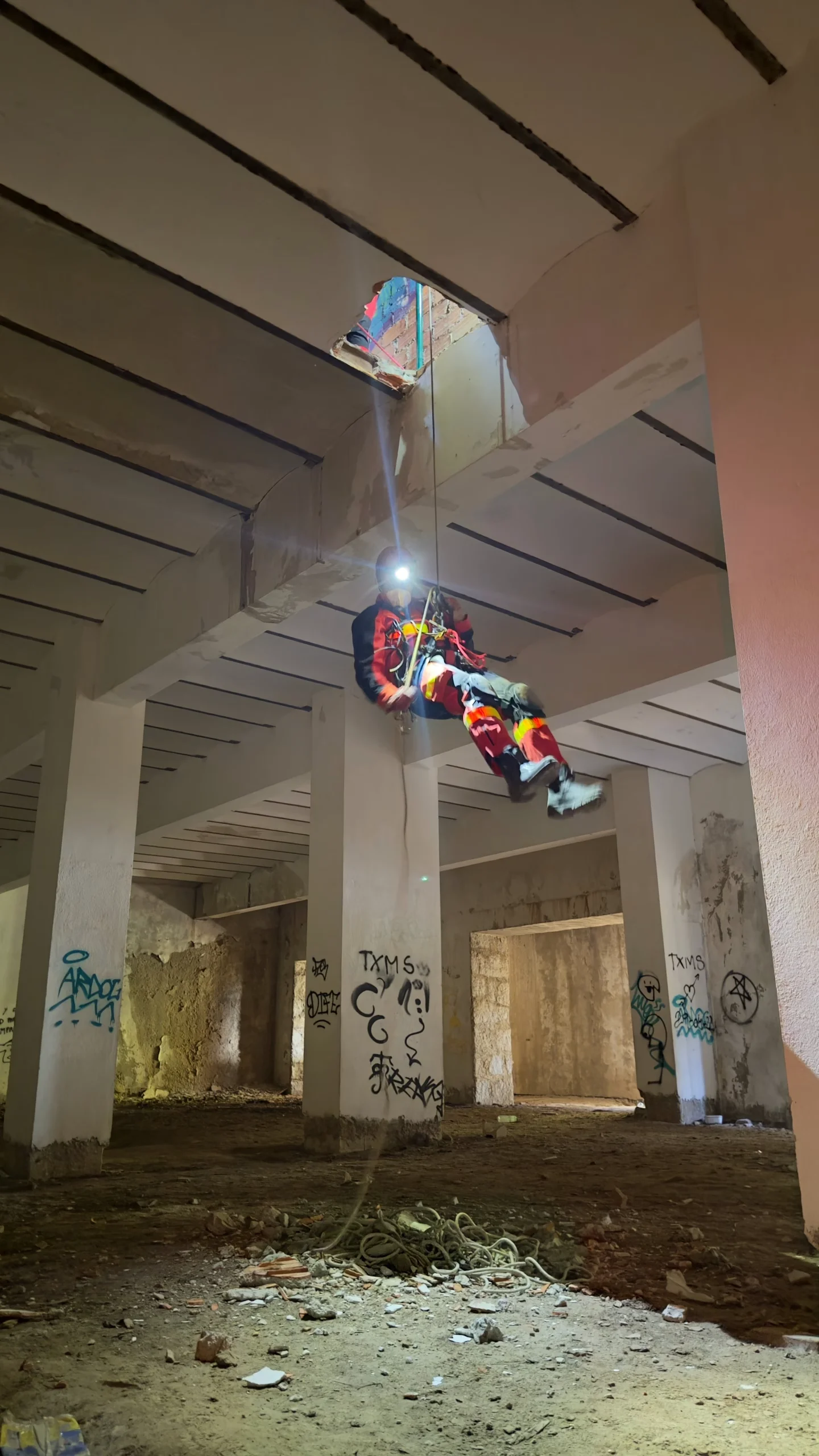 A nuestra llegada, tras 48 horas de operativos de rescate en la zona afectada por el terremoto, se localizó en la planta -1 en una galería a una víctima. El acceso resultó especialmente complejo debido a la inestabilidad y peligros inherentes a la estructura colapsada.