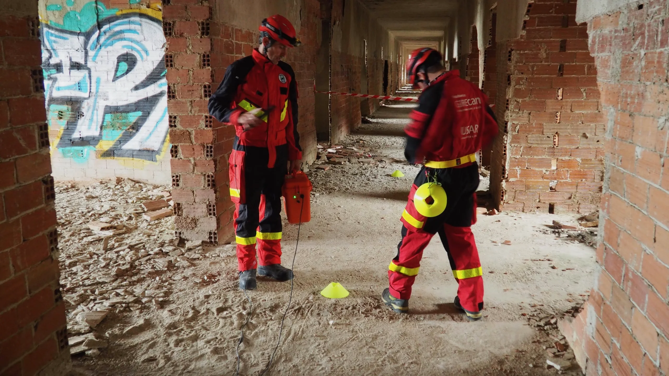 Posteriormente, tras asegurar la estructura de la ventana, ingresó al edificio el equipo de localización técnica para las tareas de búsqueda de víctimas. En particular, este grupo utiliza equipos de última generación como el radar scan (LEADER SCAN MS 1), la cámara térmica (Tecnología al servicio USAR) y el geófono (Prácticas RADAR SCAN y Geófono). De modo que, el radar scan es capaz de detectar movimientos mínimos en espacios confinados y bajo escombros, mientras que la cámara térmica identifica el calor corporal de las víctimas y el geófono detecta vibraciones y sonidos para la localización de personas atrapadas.